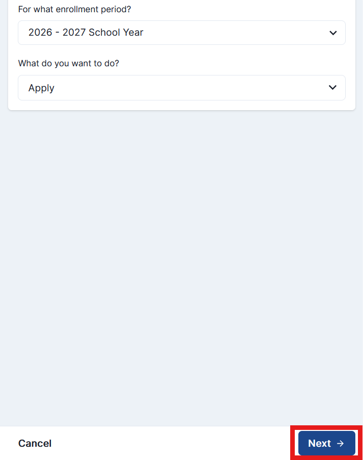 Step 5: Select the enrollment period and “Apply” form. Lastly, click Next to proceed to the application.